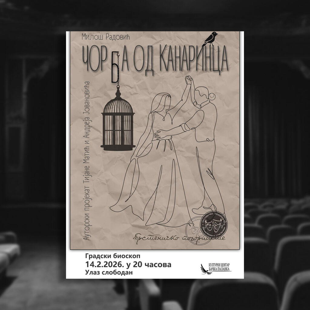 У Градском биоскопу 14. фебруара у 20.00 часова биће одиграна позоришна представа „Чорба од канаринца“, ауторски пројекат Тијане Матић и Андреја Јовановића, у извођењу Трстеничког позоришта.