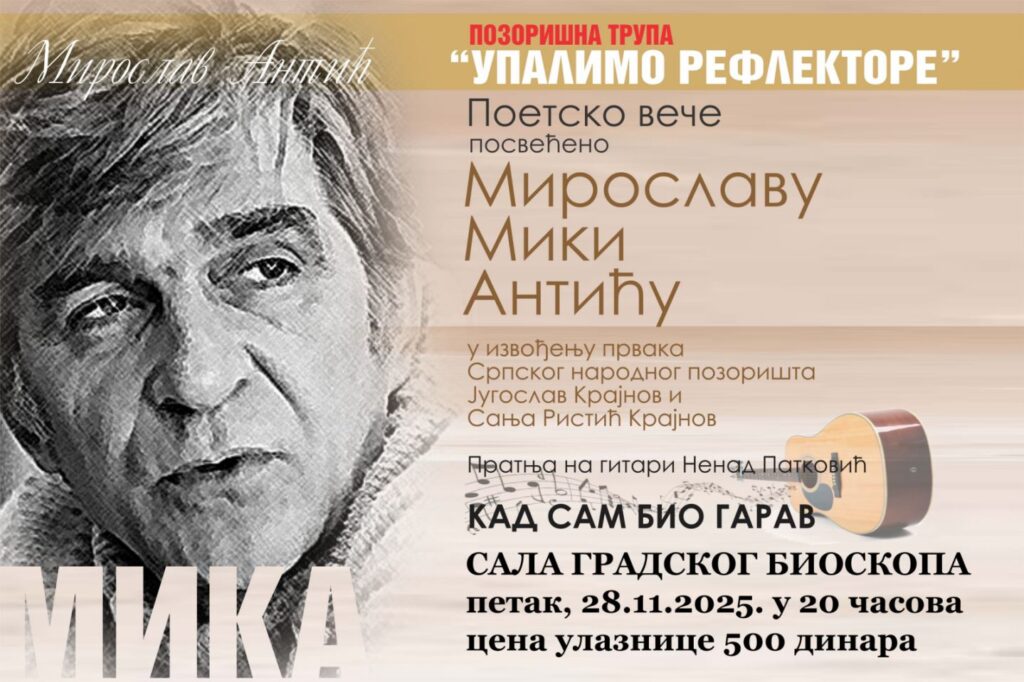 У Градском биоскопу 28. новембра у 20.00 часова биће одржано поетско вече посвећено Мирославу Мики Антићу у извођењу првака Српског народног позоришта Југослава Крајнова и Сање Ристић Крајнов.