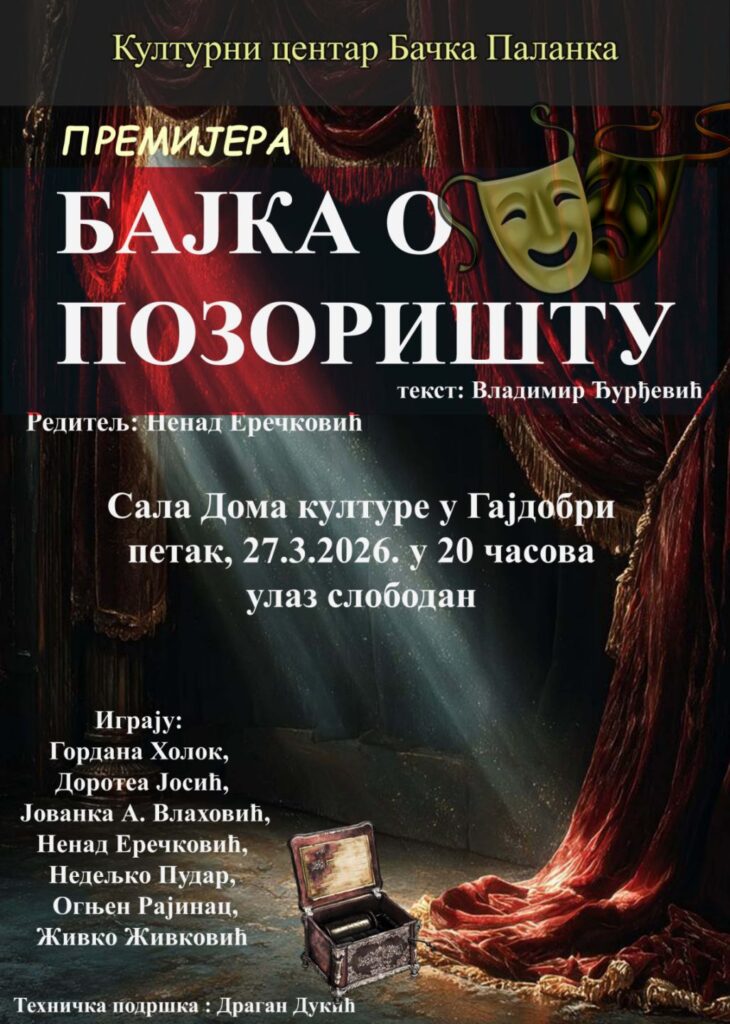 Поводом „Недеље позоришта“ која се обележева од 20. до 27. марта у сали Дома културе у Гајдобри 27. марта у 20.00 часова биће одиграна премијера позоришне представе „Бајка о позоришту“ по тексту Владимира Ђурђевића.