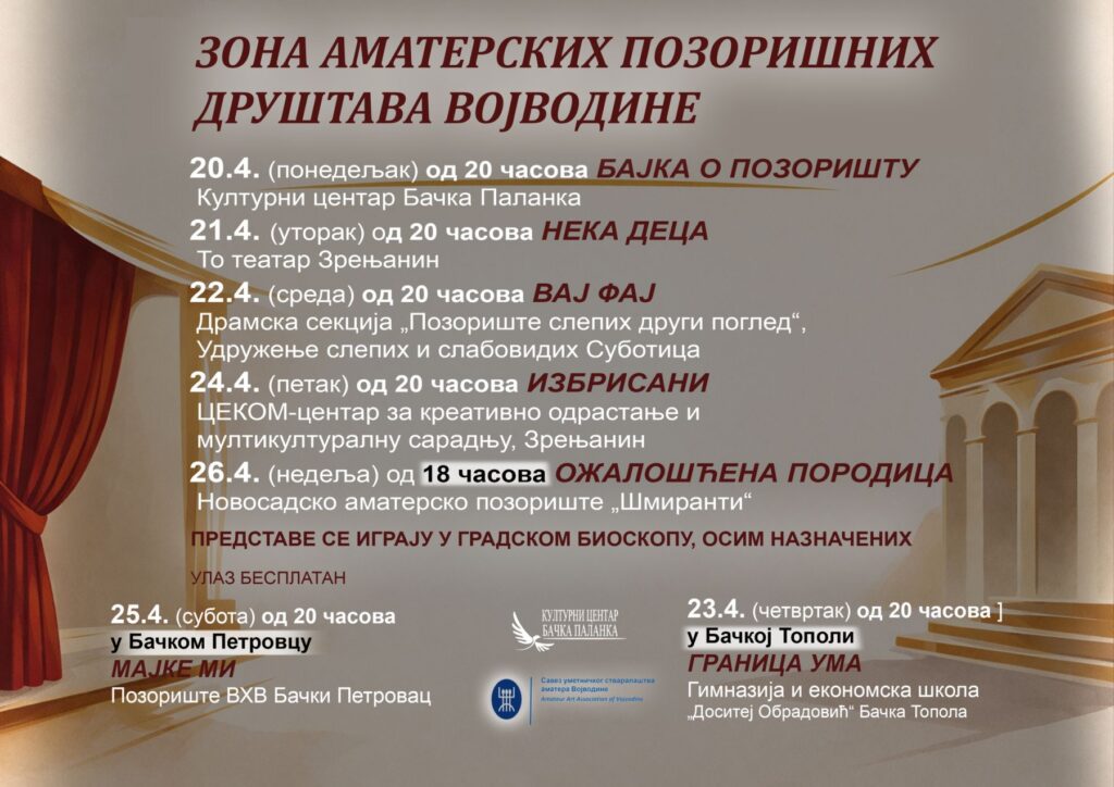 26.4. (недеља) у 18.00 часова „Ожалошћена породица“ Новосадско аматерско позориште „Шмиранти“ Нови Сад
